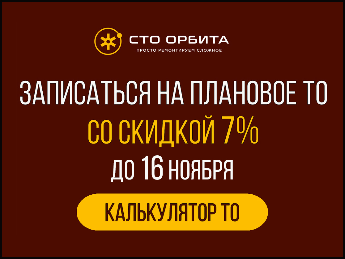 До 16 ноября на СТО «Орбита» действует скидка 7% на плановое ТО (работы + запчасти) только при записи через сайт. Пройди техобслуживание с выгодой для своего кошелька -  не упусти выгодное предложение! Удобный калькулятор позволяет в 3 клика узнать актуальную стоимость нужного ТО. Цены и скидки на сайте обновляются каждый день, поэтому на них можно смело ориентироваться при расчете стоимости.
